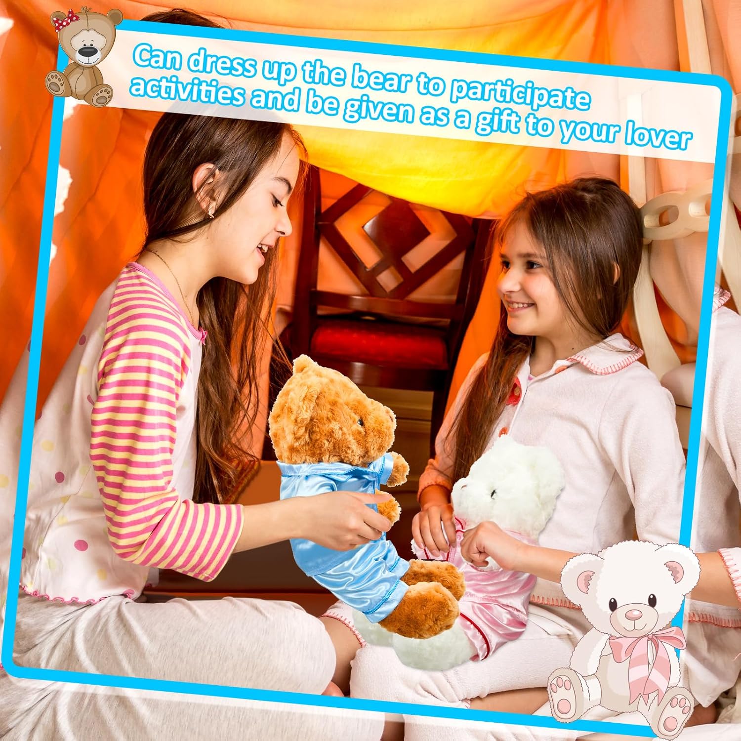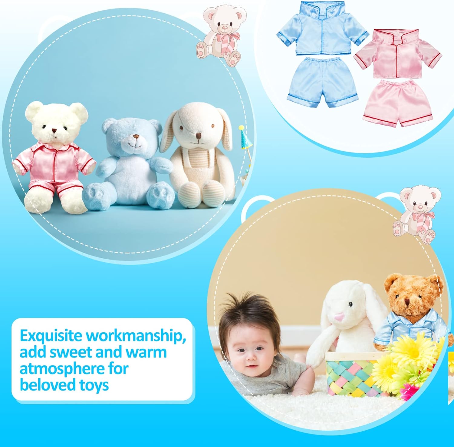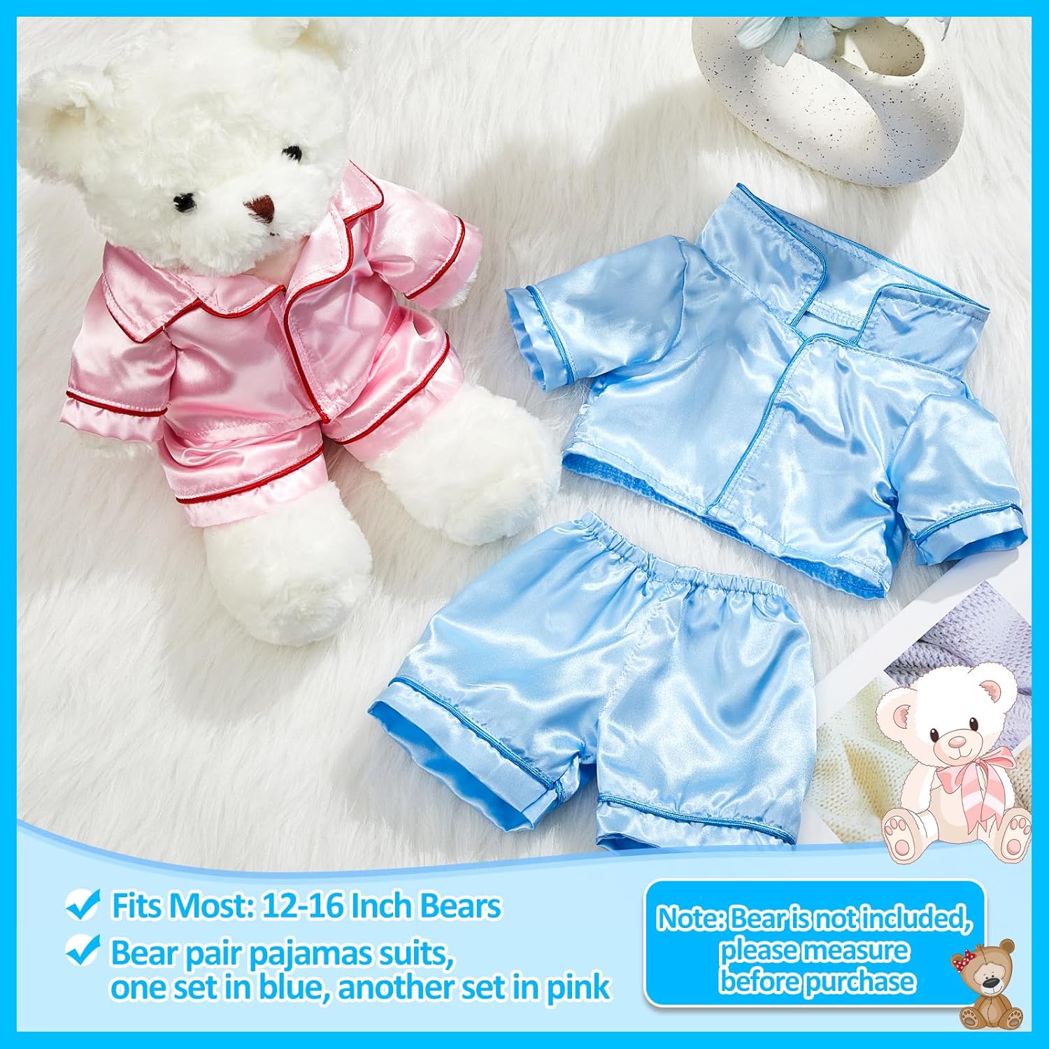 Bears pajamas set (bear is not included): you will get 2 sets of stuffed bear clothings, one set of pink and one set of blue with the same printing, including shirt and trousers, creating a warm and sweet atmosphere; Note: bear is not included