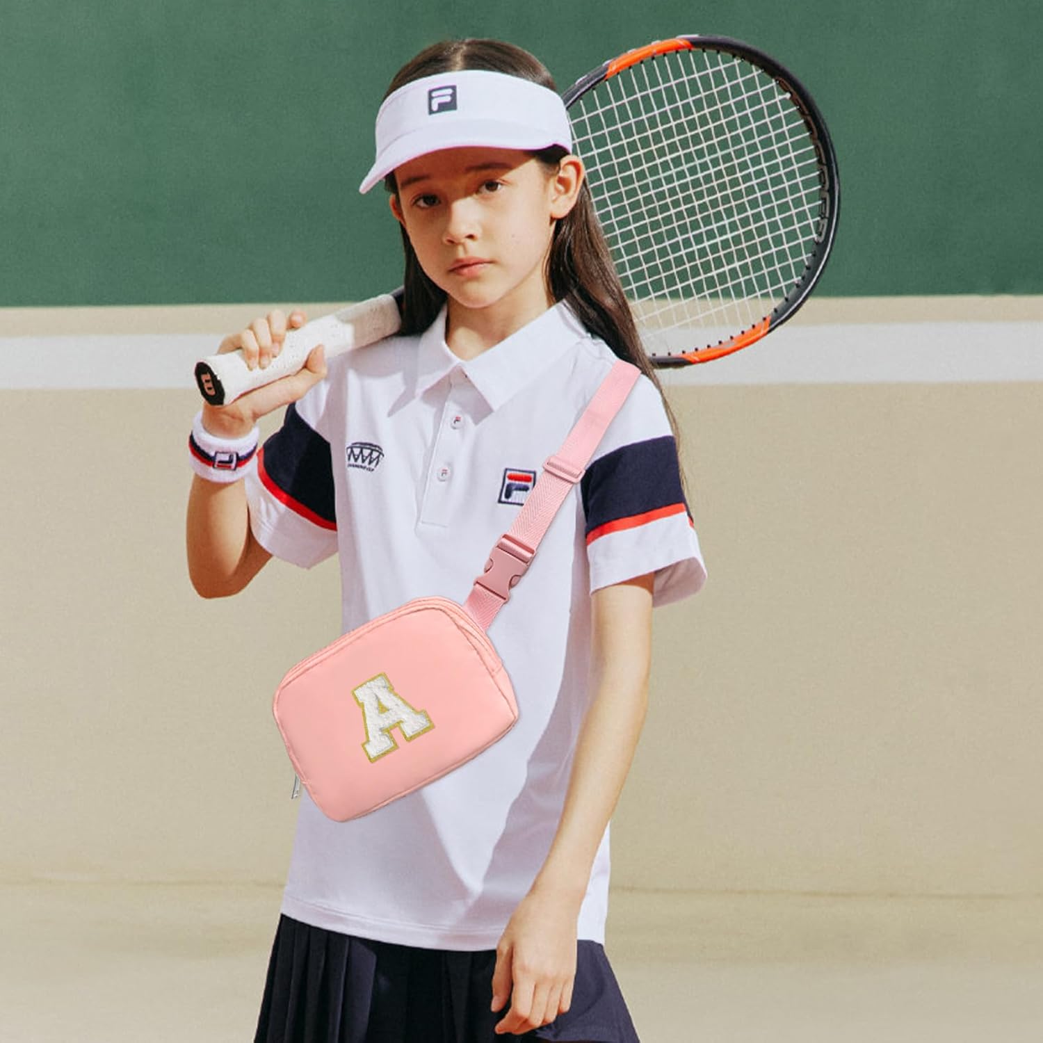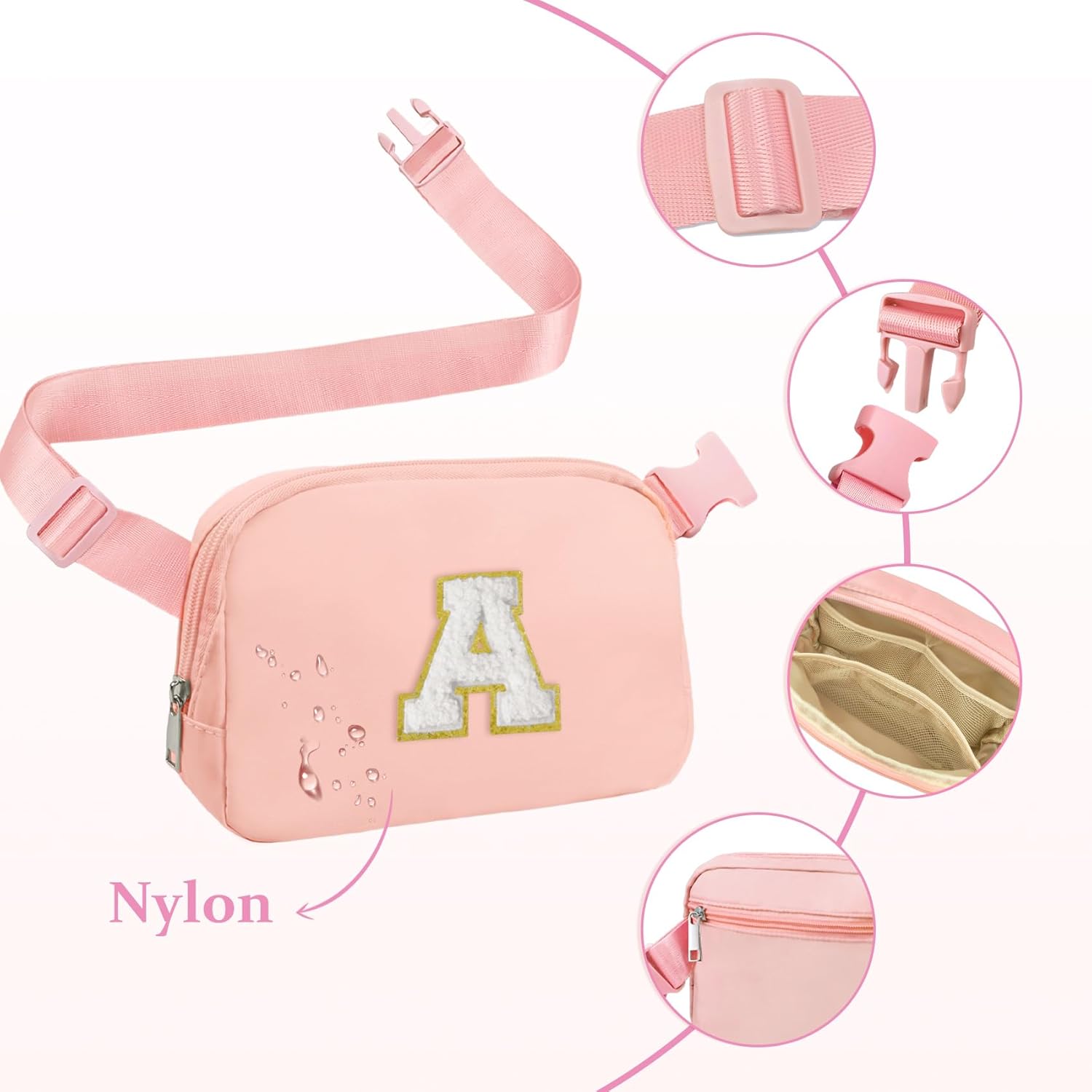 [SEWN Chenille Letter Patch on Girls Fanny Pack] Puffy embroidered chenille letter patch A-Z stitched permanently on this pink fanny pack for girls, fashion waist pack teen girl gifts trendy stuff for girls every big day like Graduation Appreciation Dance Recital Performance First Communion.