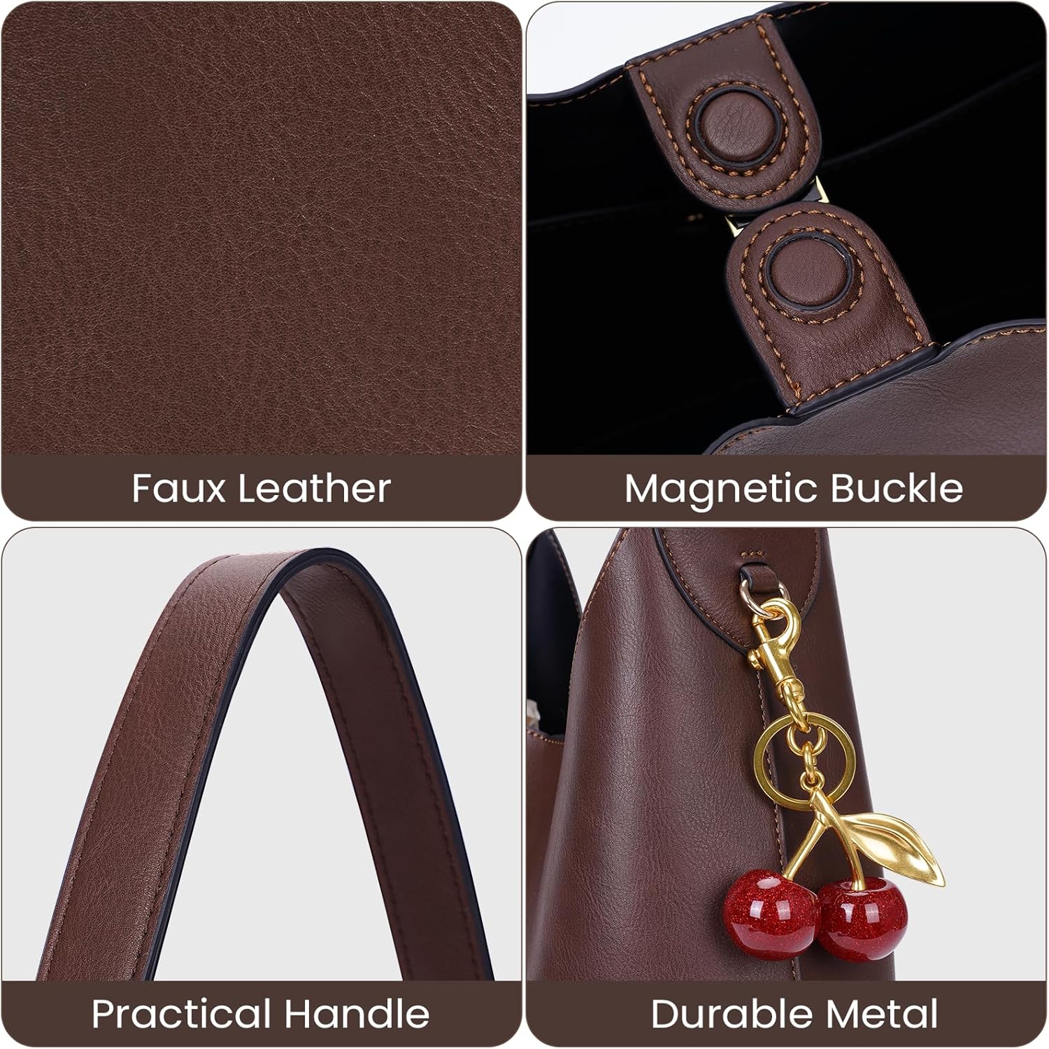 Customers find the handbag visually appealing, with one noting it looks like real leather, and appreciate its high-end appearance. Moreover, the bag receives positive feedback for its quality, size with multiple pockets, and effectiveness as a Coach Brooklyn dupe. Additionally, customers like the burgundy color, cherry charm, and consider it worth the price. However, the material quality receives mixed reviews, with some praising it while others find it cheaply made.